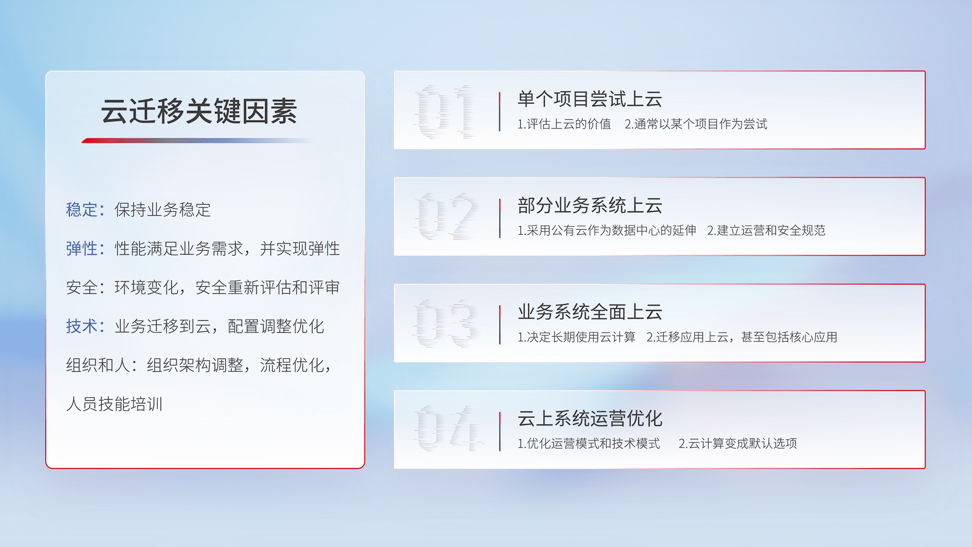 结合实际业务,,,从规划设计、、云平台选型、、、云原生改造、、、数据迁移、、、集成交付,,迁移全过程为客户识别最佳上云路径,,,做好风险识别管理,,设计网络架构、、、身份权限、、、安全审计合规、、操作审计、、日志审计、、、监控告警策略、、、多站点容灾设计等,,对云上基础设施进行整体规划,,,,提升IT治理水平,,以满足弹性、、高可用、、高性能的需求。。